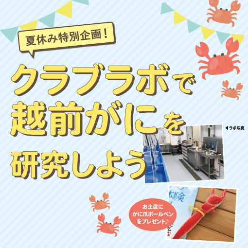越前がにミュージアムを見学した後に、普段は入ることができない、カニ博士(学芸員)のクラブラボでの研究を知れる、特別な見学プラン。夏休みの自由研究にもおススメです☆研究者気分でカニの生態について学ぼう♪