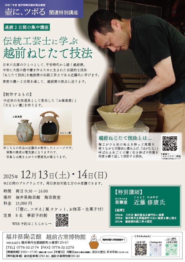 伝統工芸士に学ぶ連続2日の集中講座 越前焼の伝統工芸士である近藤修康氏に学ぶ2日間。鎌倉時代より伝わるねじ立て技法で「お歯黒壺」と「火もらい甕」を作ります。特別講師 萌蘖窯 近藤修康 氏 イベント情報 開催場所 福井県陶芸館 陶芸教室 内容 伝統工芸士によるねじたて技法講座 ※2日間のプログラムです 開催期間 2025年12月13日(土)・14日(日) 受入人数 8名(事前予約・両日参加できる方のみ) 料金 15,000円(特別展チケット、呈茶付) ご予約 ご予約はこちら 基本情報 住所 福井県越前町小曽原120-61 電話番号 0778-32-2174 (福井県陶芸館) 営業時間 各日9:30~16:00 駐車場 あり Webサイト 詳細はこちら(福井県陶芸館HP)