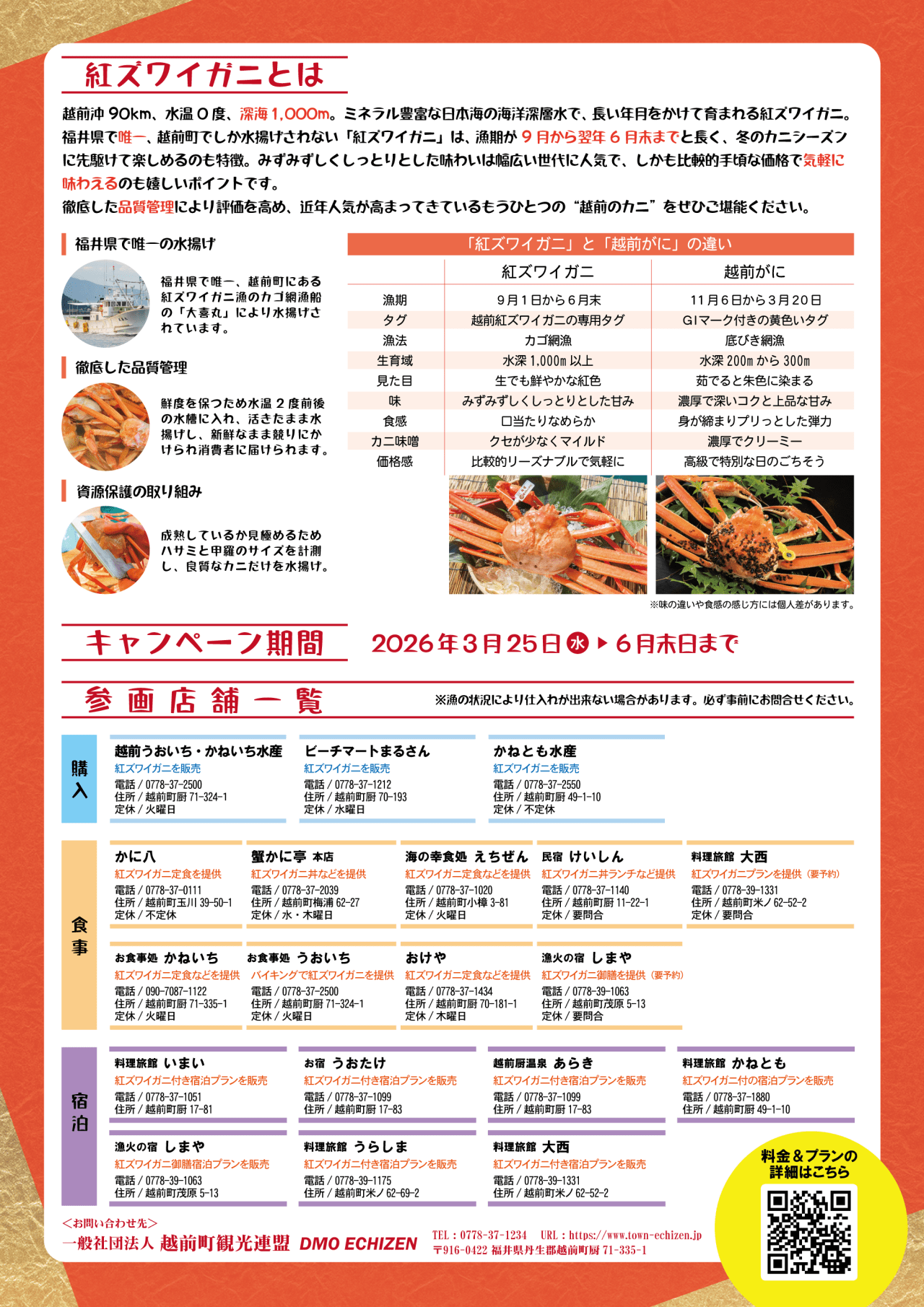 期間中は、町内の飲食店や宿泊施設で紅ズワイガニを使ったメニューをご用意。また、町内のお魚屋さんにも旬の紅ズワイガニが並びます。
