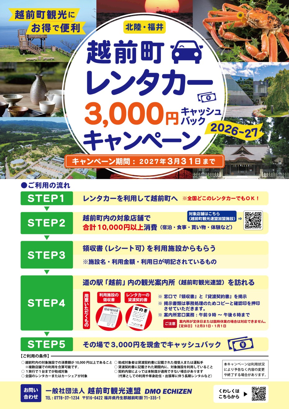 越前町観光連盟では、レンタカーを活用した周遊観光を促進するため