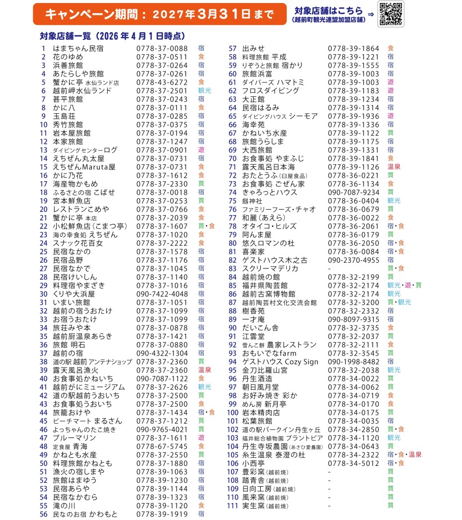 ・越前町観光連盟加盟の施設で 合計10,000円以上利用 ⇒ 3,000円キャッシュバック