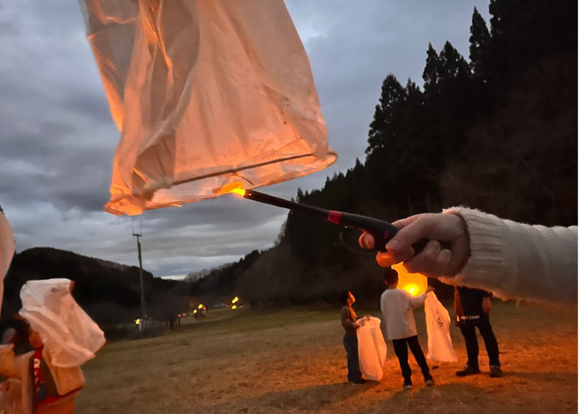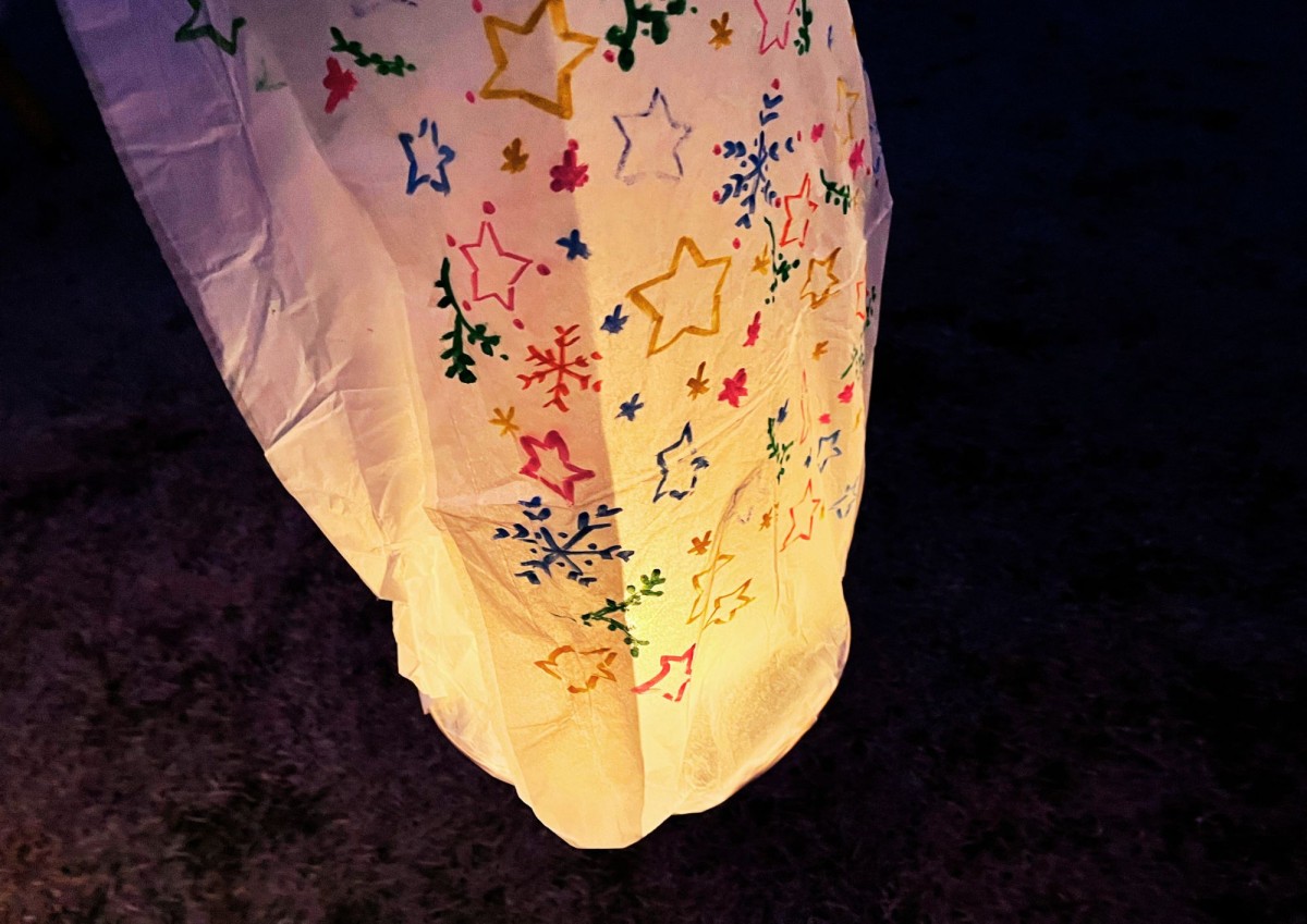 火がついてから、中に温かい空気がたまるまで待ちます。熱気球と同じ原理ですね。もうすっかり辺りが暗いので持っているランタンの灯がとてもきれいです。描いた絵もきれいに映し出されていました。