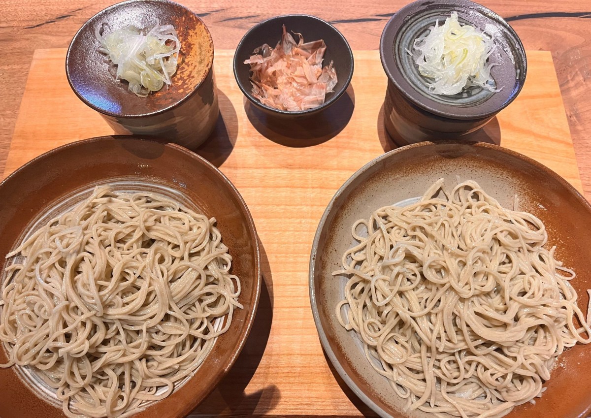 二色そばはどちらも味わうことができる一石二鳥の一品。2種類のおそばが並びますが、お昼ごはんにはぴったりの量。食べ比べながら楽しめるので、楽しみも増えます。