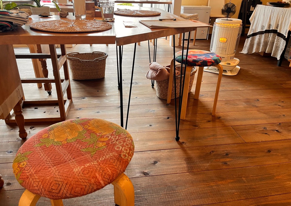 デザインラボチカの布を張ったスツールはエスニックなお店の雰囲気にもぴったり。布を選んでイスを作るワークショップも時々開催されているようです。
