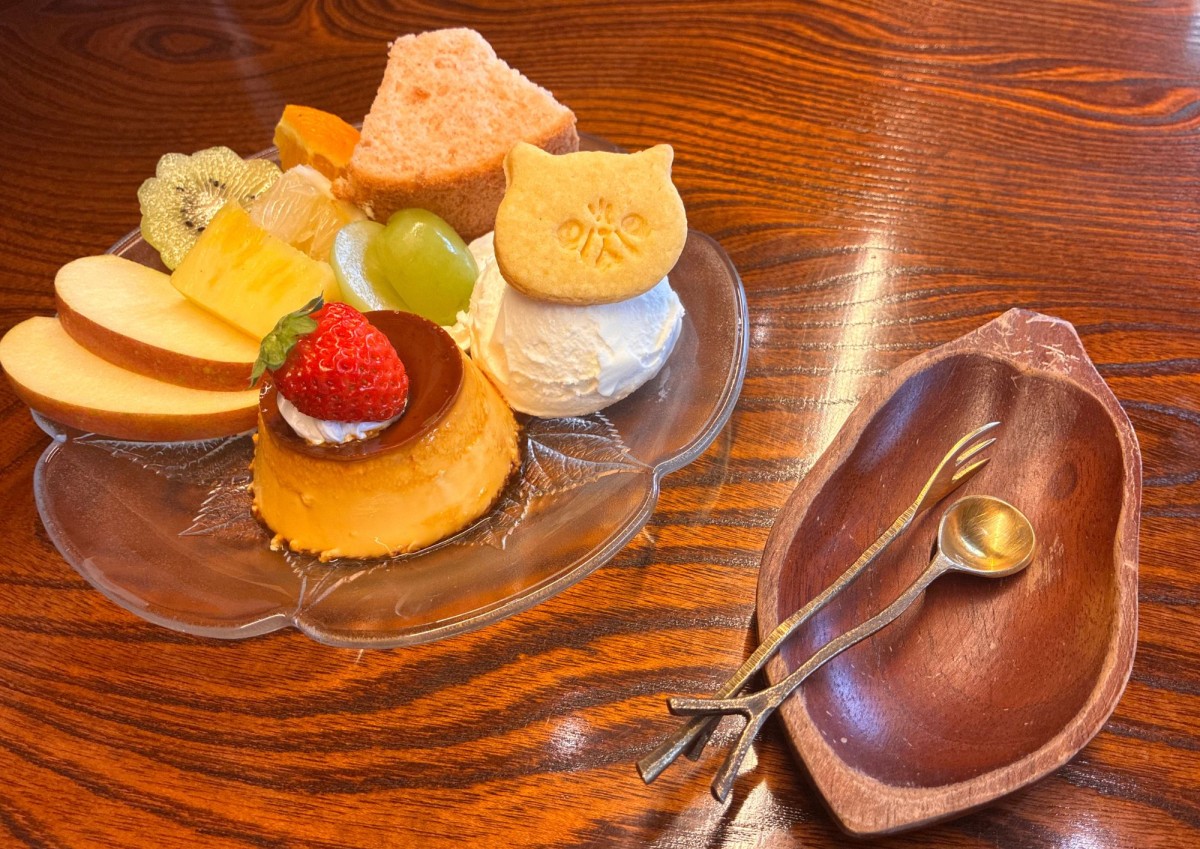 ずっと食べたかったプリンアラモード。かわいいねこちゃんのクッキーが添えられています、フルーツもたっぷり。自家製プリンも味わえるぜいたくな一品です。