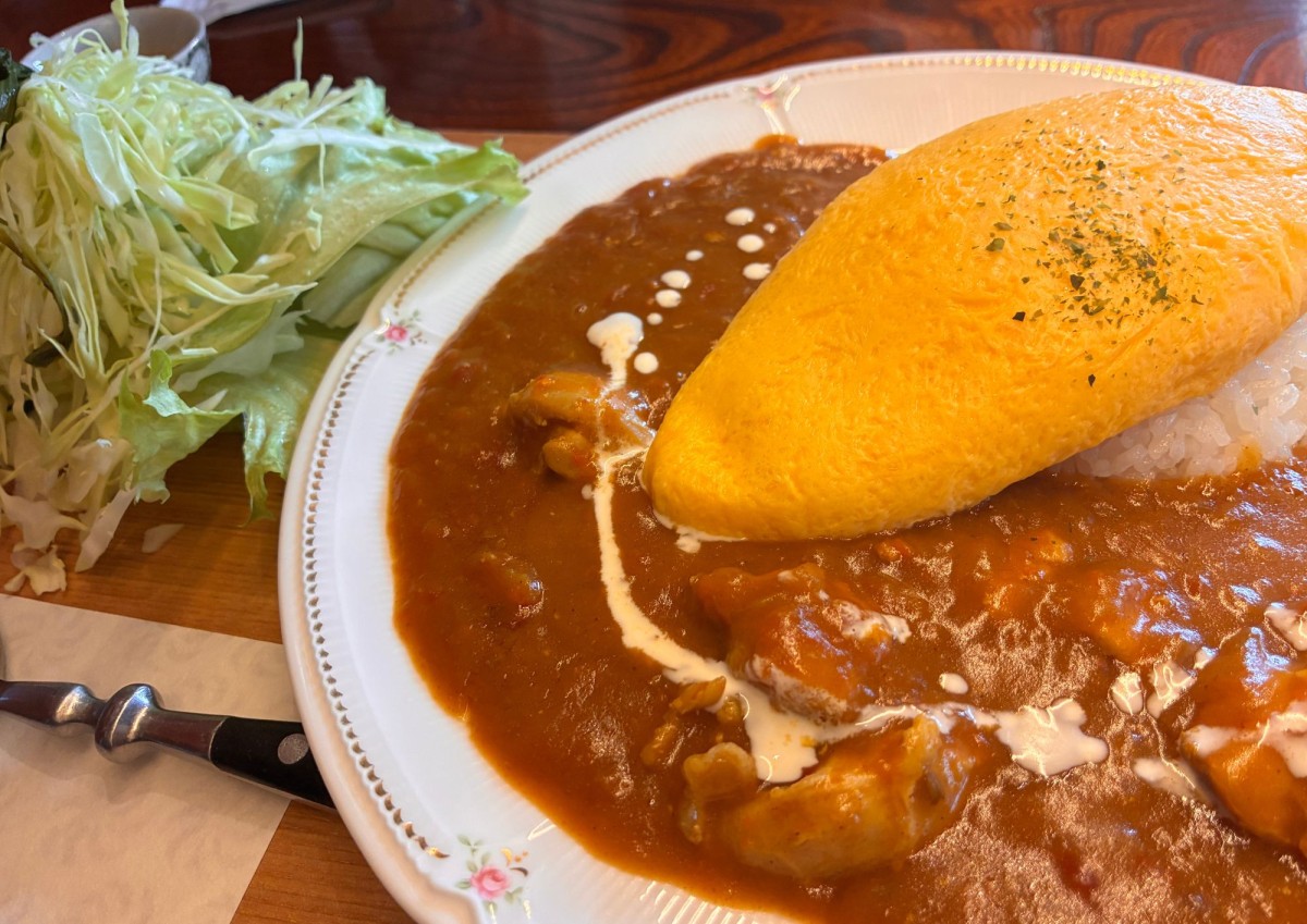 盛り付けもとてもおしゃれです。カレーとオムレツが一緒に食べられて、ボリュームたっぷり。オムレツ卵はとろとろ。お野菜もたっぷりで食べ応えありの一品でした。
