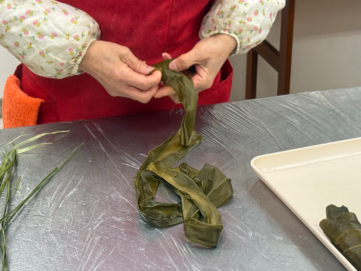 巻いた昆布は、棕櫚の葉を細くした紐で結び留めます。