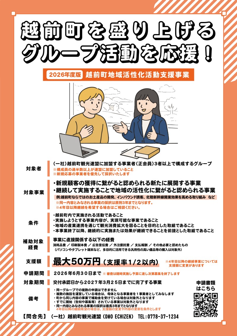 一般社団法人越前町観光連盟(以下「連盟」という)に正会員として加盟している事業者が主体となって行う取組に対して越前町地域活性化支援金(以下「支援金」という)を支援することで、地域のにぎわいづくりと持続可能な地域産業につなげることを目的とする。