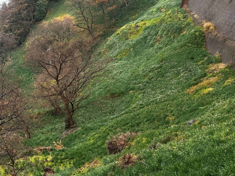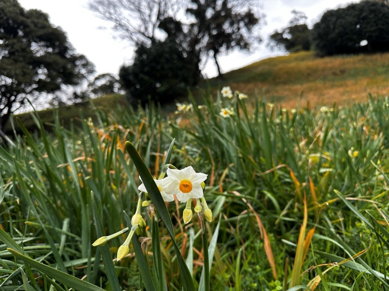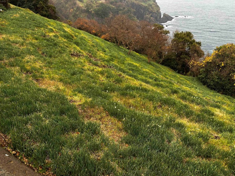 ここ最近気温が高かったことで、越前岬水仙ランドで、場所により3分咲き。