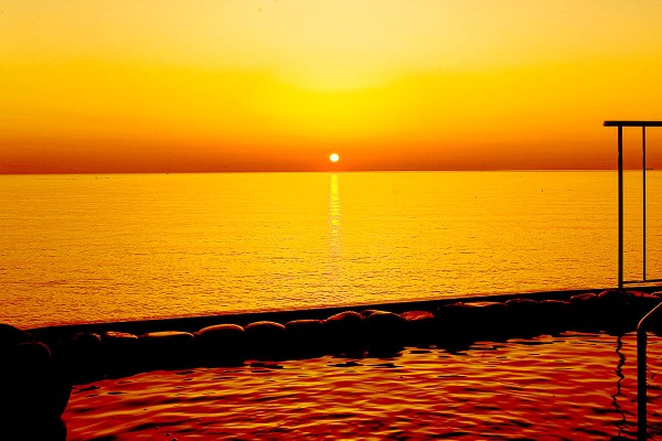 日本海を眼前に臨む露天風呂からは、水平線に沈む夕日を湯船に浸かりながら堪能できます。