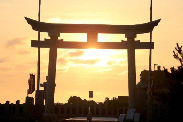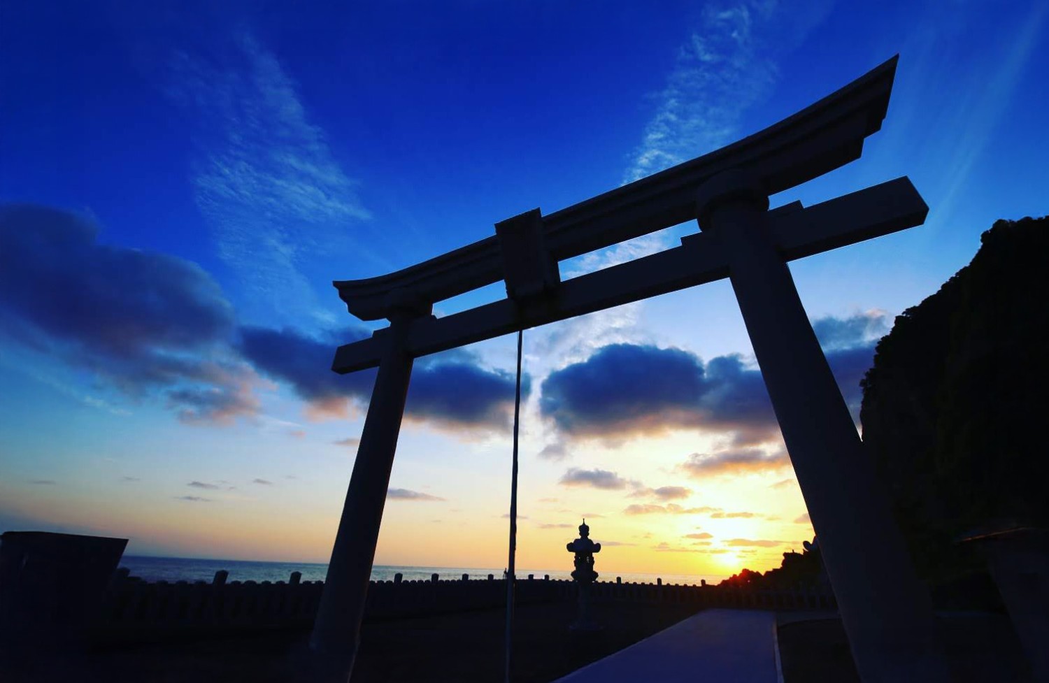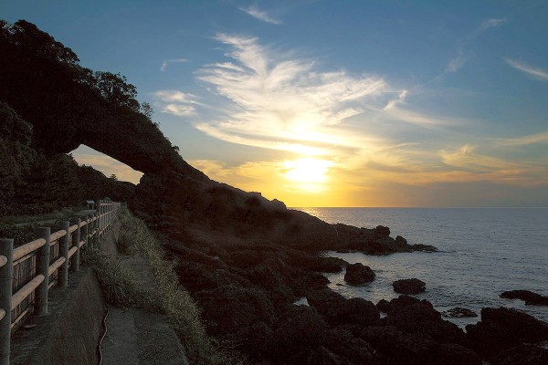 かつてはこの下を国道が通っていたほどの規模を誇ります。ダイナミックな奇岩のシルエット越しに沈む夕日は、まさに自然の芸術です。