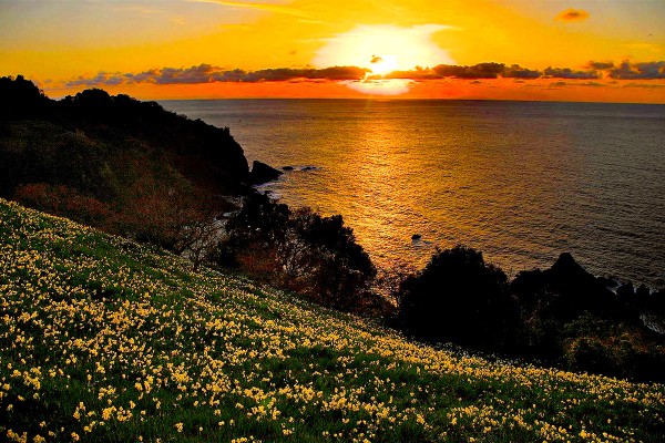 急峻な斜面から見下ろす海と水仙、そして夕日のコラボレーションは、写真家にも人気の非常に幻想的な風景を作り出します。