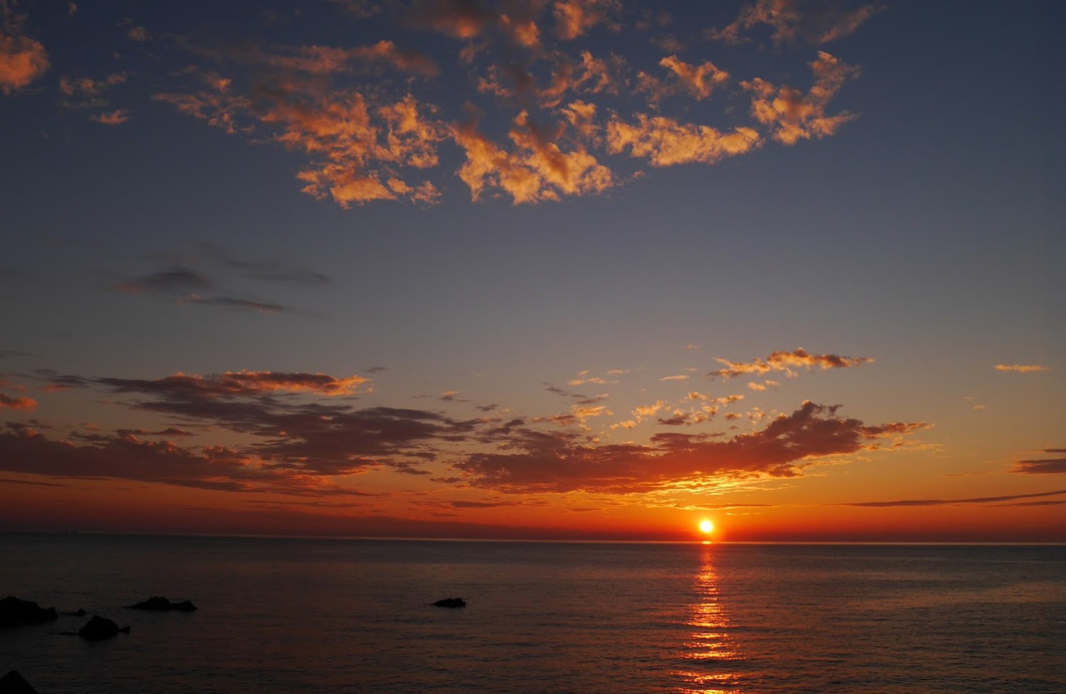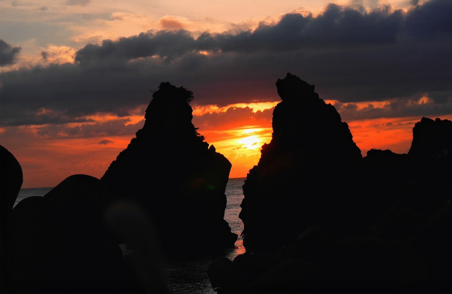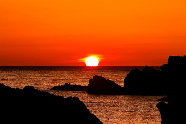 海岸沿いの奇岩越しに眺める夕日も格別です。